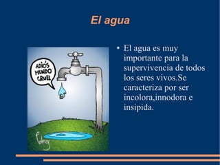 El documento describe las propiedades del agua y sus diferentes estados. El agua es esencial para la vida y puede encontrarse como hielo, nieve, lluvia, ríos, mares u océanos en estado sólido o líquido, o como vapor en estado gaseoso. Cambia de estado sólido a líquido con el calor y de gas a líquido con el enfriamiento.