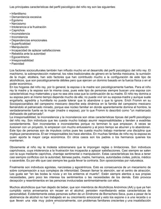 2) También describe el "niño rey", un alcohólico con una personalidad inmadura e infantil que demanda atención pero no asume responsabilidades. Carece de constancia y es manipulador.