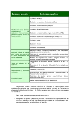 Este documento presenta una unidad didáctica sobre técnicas de unión fija en tuberías. La unidad incluye objetivos, contenidos y actividades. Los objetivos son interpretar planos, ejecutar uniones fijas según materiales y normativa. Los contenidos cubren tipos de soldadura, requisitos, uniones, deformaciones y control de calidad. Las actividades incluyen prácticas de soldadura eléctrica, blanda, fuerte y TIG aplicando los conocimientos teóricos.