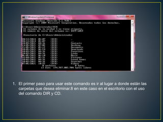Este documento proporciona instrucciones para eliminar archivos en Windows utilizando el comando ERASE. Explica los pasos de ir a la carpeta donde se encuentran los archivos a eliminar usando los comandos DIR y CD, luego usar el comando ERASE seguido del nombre del archivo para borrarlo de la carpeta seleccionada.