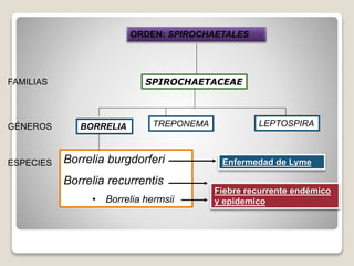 Este documento describe la familia Spirochaetaceae, que incluye los géneros Borrelia, Treponema y Leptospira. Borrelia burgdorferi causa la enfermedad de Lyme, mientras que Borrelia recurrentis causa la fiebre recurrente endémica y epidémica. Estas espiroquetas son helicoidales, delgadas y móviles, y se mantienen en mamíferos y artrópodos vectores como garrapatas y piojos. Pueden causar enfermedades al infectar a humanos a