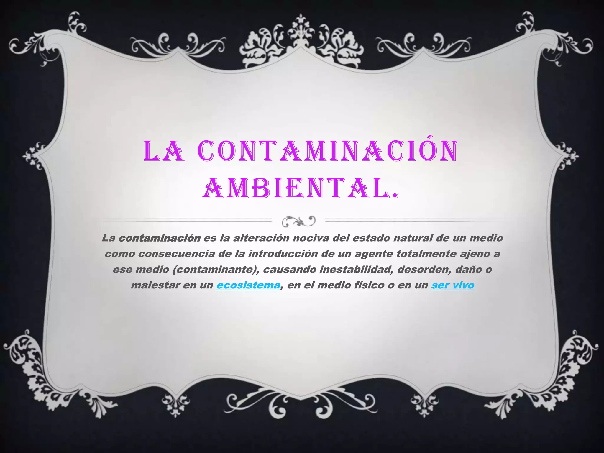La contaminación ambiental se define como la alteración nociva del medio natural debido a la introducción de un agente contaminante ajeno al ecosistema, causando daños e inestabilidad. A medida que el poder humano sobre la naturaleza aumenta y surgen nuevas necesidades sociales, el medio ambiente se deteriora cada vez más. Los principales tipos de contaminación son los que afectan recursos vitales como el aire, suelo y agua.