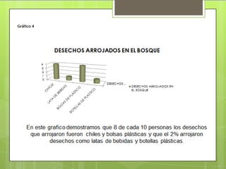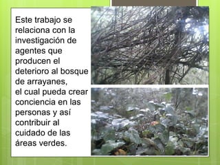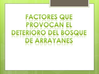 Este documento trata sobre los factores que causan el deterioro del bosque de arrayanes único en el Ecuador, ubicado en la comunidad de Monte Verde, Carchi. Los objetivos son concientizar a las personas sobre el valor de cuidar el bosque y dar a conocer los factores de deterioro como la contaminación, mal uso de senderos, y daño a los árboles. Se propone realizar charlas educativas y campañas para promover la conservación de esta importante área verde.