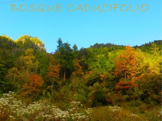 Un bosque caducifolio se compone de árboles como robles y arces que pierden sus hojas cada año debido a los inviernos fríos. Se encuentra en regiones con veranos cálidos e inviernos fríos y lluvias abundantes. La fauna incluye animales como ciervos, zorros y aves que se adaptan a las estaciones del año, entrando algunos en hibernación e migrando otros a zonas más cálidas en invierno.