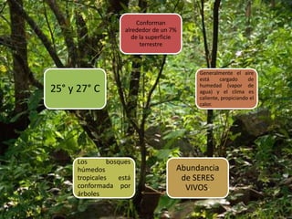 Los bosques húmedos tropicales conforman alrededor del 7% de la superficie terrestre y se caracterizan por tener un clima cálido y húmedo con temperaturas entre 25° y 27° C y precipitaciones constantes de al menos 1500 mm al año. Estos bosques se encuentran en la región ecuatoriana de la Cordillera del Cóndor y albergan una gran abundancia y diversidad de seres vivos, incluyendo especies de plantas como el platanillo, el cedro americano, el guayacán y el higuerón.