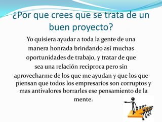 Isabel quiere ayudar a las personas de manera honrada a través de un proyecto que brinde oportunidades de trabajo. Los beneficios incluyen su estabilidad económica y emocional, así como dar oportunidades a otros para que alcancen sus objetivos a través de medios honrados. Reconoce que necesita recursos como motivación, esfuerzo y tolerancia al error, así como dinero que espera obtener a través de estudios para ganar más oportunidades en el futuro.