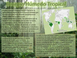 La selva tropical es el ecosistema más extenso que alberga la mayor biodiversidad del planeta a pesar de ocupar menos del 7% de la superficie terrestre. Contiene más del 50% de las especies del mundo caracterizadas por una gran variedad de plantas, insectos, aves y otros animales. El documento describe las características climáticas y de vegetación de este importante ecosistema.