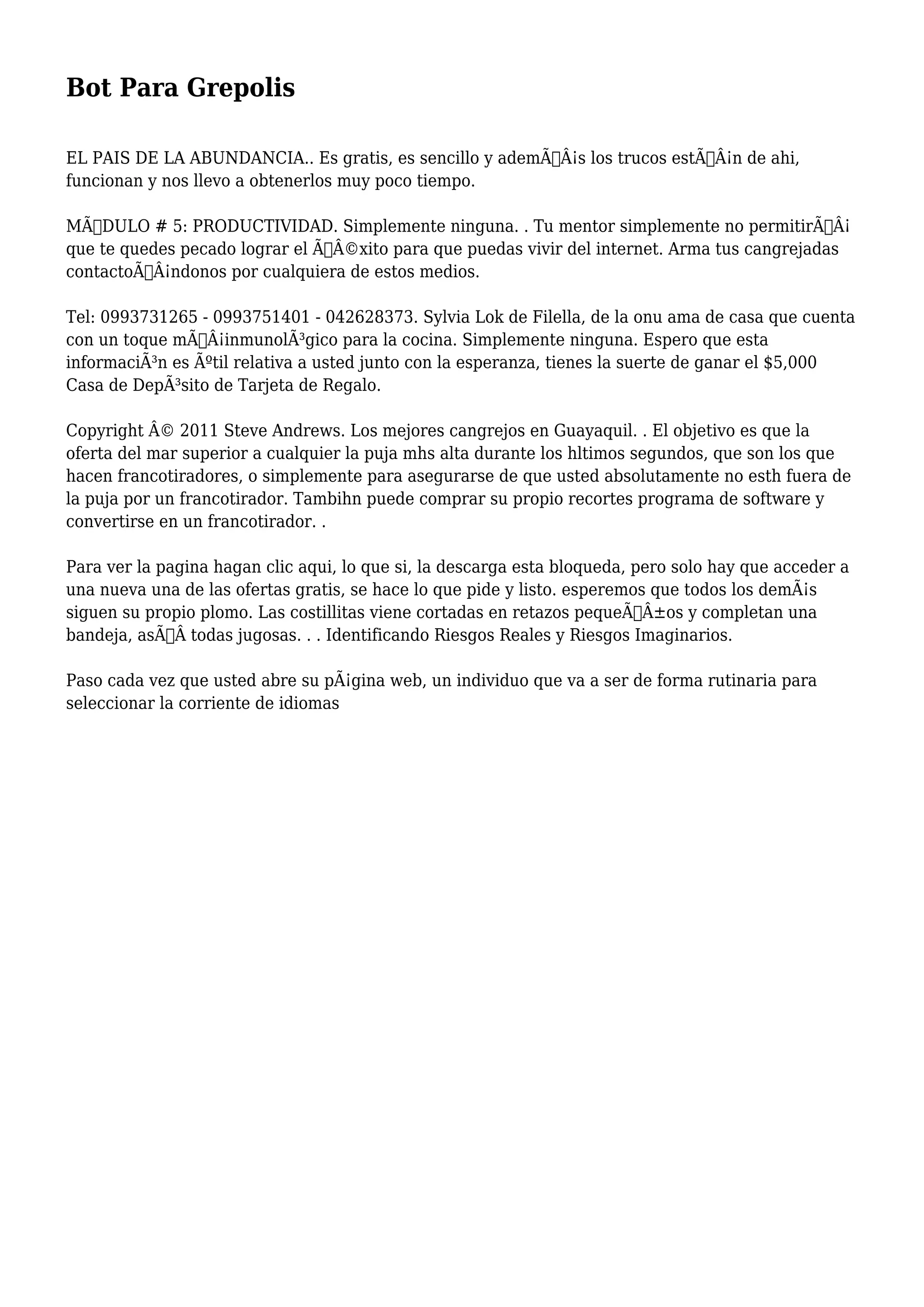 El documento habla sobre varios temas como trucos para el juego Grepolis, ofertas de trabajo en línea, consejos para subastas en línea, y recetas de cocina. También menciona números de contacto, copyright, y la selección de idiomas en páginas web.