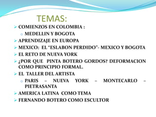 Botero comenzó su carrera artística en Medellín y Bogotá. Más tarde estudió en Europa, especialmente en Florencia, donde se enfocó en los maestros del Renacimiento. Luego pasó tiempo en México y Washington D.C., antes de establecerse en Nueva York en 1960, donde pasó años de soledad y dificultades pero también tuvo éxito. A lo largo de su carrera, Botero desarrolló su estilo característico de figuras redondeadas y voluminosas.
