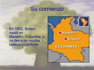 Este documento describe la vida y obra del pintor colombiano Fernando Botero. Comienza explicando el origen de Botero en Medellín, Colombia y como su estilo "inflado" de figuras gordas se desarrolló inicialmente en bodegones antes de aplicarse a obras maestras clásicas y pinturas originales. Más tarde, Botero usó su estilo para criticar problemas sociales como la guerra contra las drogas y el narcotráfico en Colombia, así como abusos estadounidenses como los de la prisión Abu Ghraib. El documento también anal