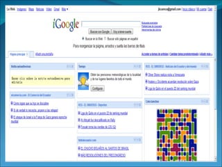 El documento explica que los botones "Añadir a Google" permiten a los propietarios de páginas webs agregar fácilmente el contenido de sus feeds RSS o Atom a la página principal de Google o Google Reader. Describe que RSS y Atom son formatos XML para distribuir noticias y contenido de sitios web. Proporciona un enlace de ejemplo para agregar un feed RSS específico a Google.