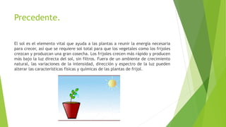 El documento describe un experimento sobre los efectos de la luz en el crecimiento de plantas de frijol. Se sembraron semillas de frijol en tres condiciones diferentes de luz: sol directo todo el día, sol directo solo por la mañana, y sombra todo el día. Se midió el crecimiento de las plantas durante tres semanas. Los resultados mostraron que las plantas con sol directo todo el día crecieron más que las otras, mientras que las plantas en la sombra crecieron menos. La conclusión fue que la luz directa favorece el cre