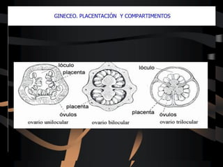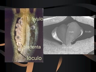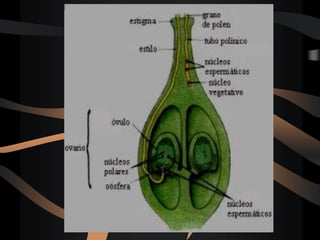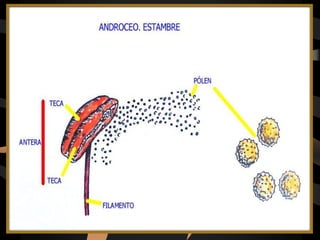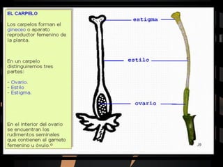 Este documento describe los diferentes tipos de reproducción en las plantas, incluyendo la reproducción asexual mediante estacas, esquejes y cultivo de tejidos, así como la reproducción sexual que involucra la meiosis, la fecundación y la formación de semillas. También explica las partes de la flor como el cáliz, la corola, el androceo y el gineceo, y los tipos de polinización como la anemófila, hidrófila y zoofilia.
