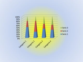 Este documento presenta tres gráficos que muestran datos de ventas y volumen para tres series en diferentes categorías y trimestres. El primer gráfico compara las tres series en cada categoría, el segundo desglosa los datos de cada serie por categoría, y el tercero muestra los volúmenes trimestrales alto y bajo.