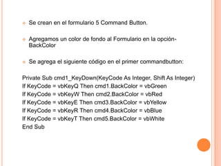 El documento describe cómo crear botones de colores en un formulario de Visual Basic. Se agregan 5 command buttons al formulario y se les da un color de fondo. Al presionar las teclas Q, W, E, R y T se cambia el color de fondo de cada botón a verde, rojo, amarillo, azul y blanco respectivamente. Al soltar la tecla, el color de fondo vuelve a la configuración predeterminada.
