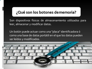 Los botones de memoria son dispositivos de almacenamiento portátiles que se pueden usar para almacenar y transferir grandes cantidades de datos, incluido texto, imágenes y archivos de voz. Consisten en un chip de silicio encapsulado en una carcasa de acero inoxidable que permite la lectura y escritura de datos a través de un dispositivo lector conectado a una computadora. Sus principales usos incluyen el seguimiento de activos, inventarios y la identificación en la agricultura.