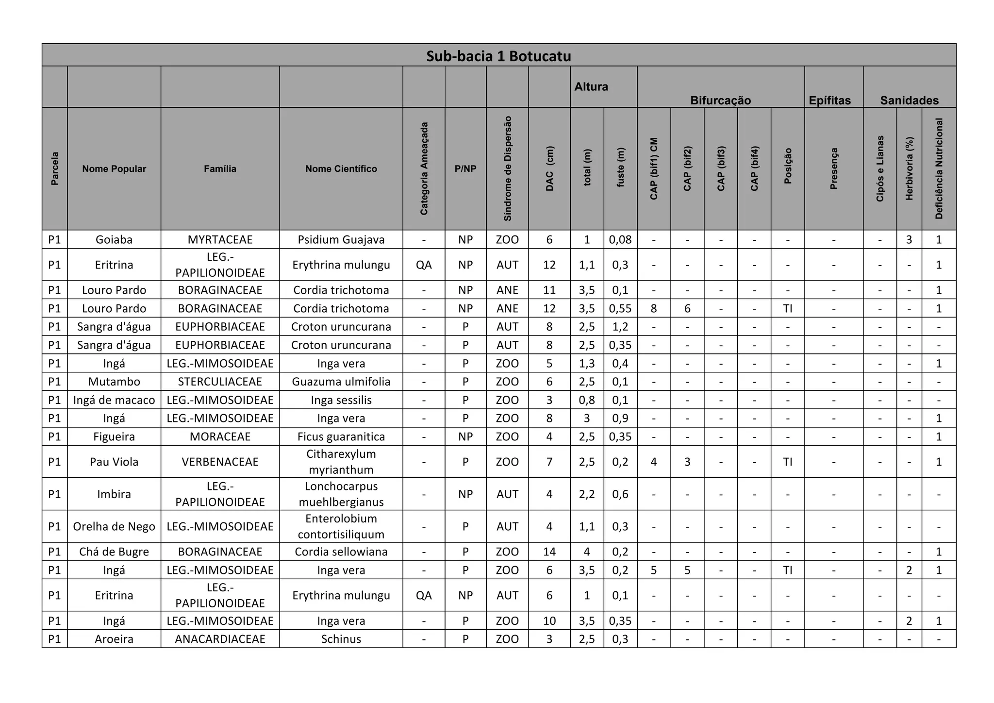 El documento presenta una diversidad de especies vegetales y sus características dentro de la sub-bacia 1 de Botucatu, incluyendo información sobre su distribución, categorías de amenaza y parámetros de medición. Se incluyen variedades de especies como Euphorbiaceae, Leguminosae y Moraceae, junto con datos sobre su dhabiancia y condiciones del suelo. La información está estructurada de manera técnica, delineando las especies más relevantes en el ecosistema y su estado de conservación.