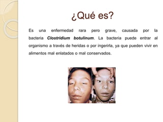 El botulismo es una enfermedad grave causada por la bacteria Clostridium botulinum que puede entrar al cuerpo a través de heridas o al ingerir alimentos contaminados. Los síntomas incluyen dificultad para respirar, tragar y hablar, así como debilidad y parálisis. Se trata con antitoxina botulínica y apoyo respiratorio en el hospital.