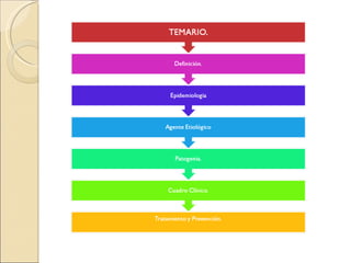 El botulismo es una enfermedad causada por la neurotoxina botulínica producida por la bacteria Clostridium botulinum. Se caracteriza por parálisis muscular descendente que puede afectar los músculos respiratorios. Se transmite principalmente por la ingesta de alimentos contaminados con la toxina preformada o por la germinación de esporas de la bacteria en heridas. El cuadro clínico incluye síntomas gastrointestinales, oftalmológicos y neurológicos como parálisis que progresa de forma simétrica. El