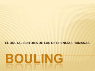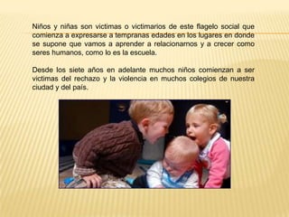 Este documento discute el problema de la violencia escolar o "bullying" en los colegios de Chile. Identifica a las posibles víctimas como aquellos que son ordenados, responsables, educados, delicados o que se destacan académicamente. Señala que los victimarios suelen ser aquellos que han sido rechazados, criticados o maltratados. Responsabiliza a la sociedad por no abordar este problema que afecta el desarrollo psicológico de los niños. Propone que para evitar ser víctima o victimario, es