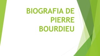 El documento presenta una biografía de Pierre Bourdieu, sociólogo francés. Detalla su lugar y fecha de nacimiento, sus estudios en la Escuela Normal Superior de París y su carrera como profesor e investigador en la Escuela de Altos Estudios en Ciencias Sociales. También enumera algunos de sus libros más importantes como La reproducción y Los estudiantes y la cultura.