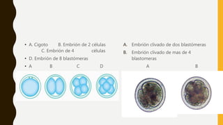 El documento describe las etapas del desarrollo embrionario de un bovino, desde la fecundación hasta el feto. Se detalla la división celular inicial, la formación del blastocisto, la implantación y las membranas extraembrionarias. Luego se explica la gastrulación y la formación de órganos y extremidades en el embrión, mostrando imágenes de diferentes etapas de gestación. Finalmente, se muestran úteros bovinos con gestaciones de varios días para ilustrar el crecimiento del feto a lo larg