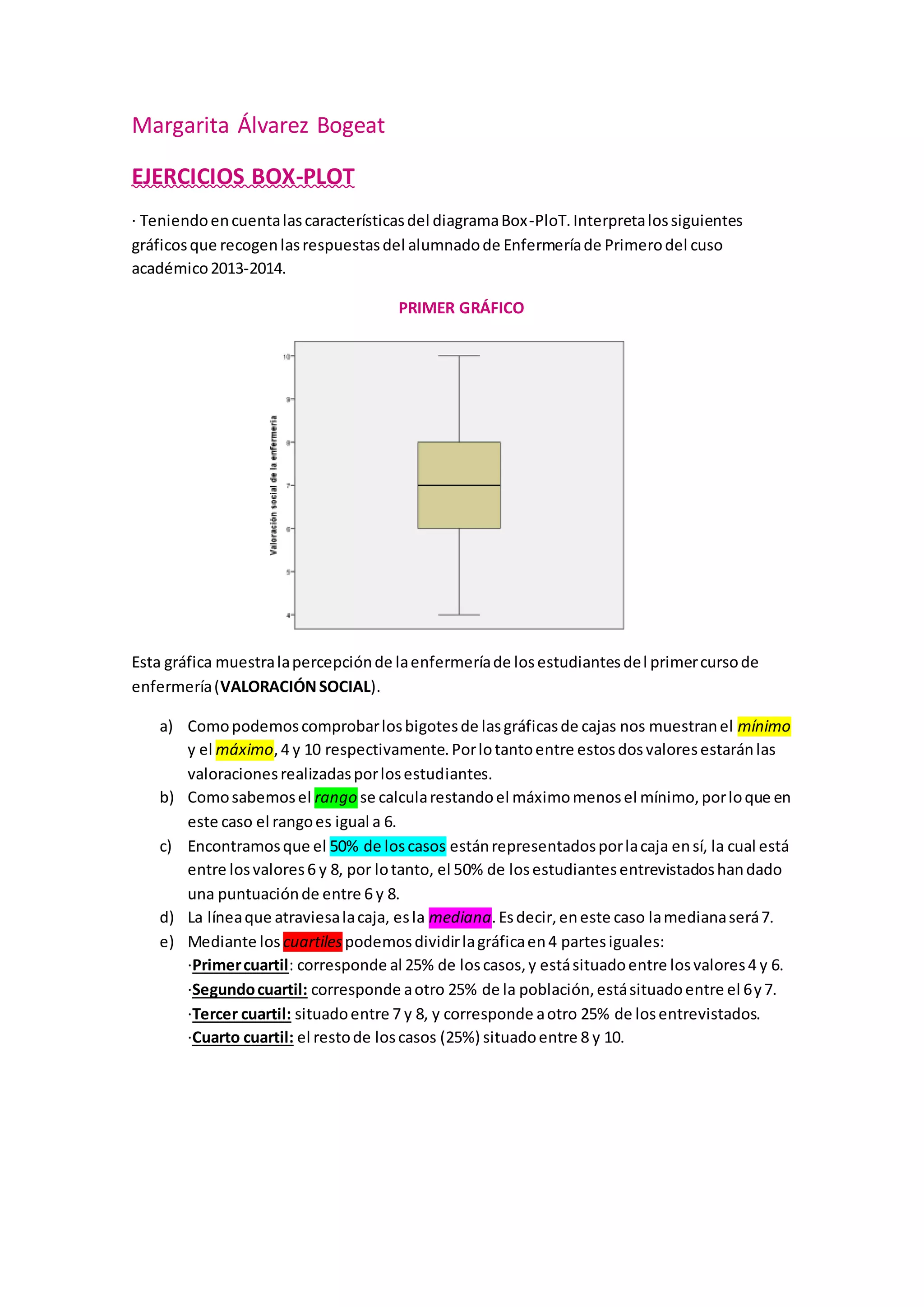 Este documento resume 4 gráficos de caja y bigotes que muestran datos estadísticos sobre estudiantes de enfermería. El primer gráfico muestra la percepción social de la enfermería con una mediana de 7. El segundo gráfico muestra horas dedicadas al deporte con una mediana de 4 horas. El tercer gráfico muestra el número de cigarrillos fumados por día con una mediana de 4. El cuarto gráfico diferencia el peso por sexo, mostrando que los hombres pesan entre 75-85 kg y las mujeres entre 55-70