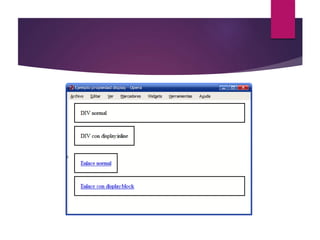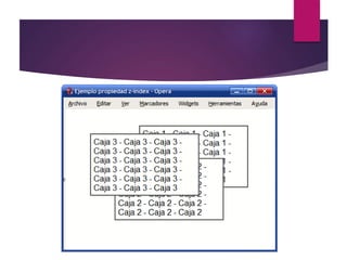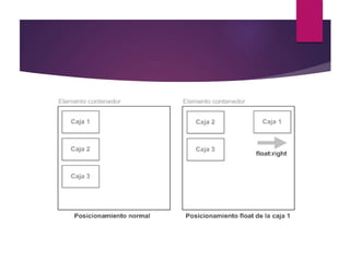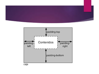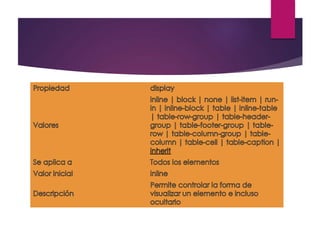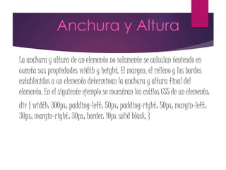 Este documento describe las principales propiedades del modelo de caja de CSS. Explica que la anchura y altura de un elemento se calculan teniendo en cuenta sus bordes, márgenes y rellenos. Además, detalla los cinco tipos de posicionamiento en CSS (estático, relativo, absoluto, fijo y flotante) y cómo controlar la visualización y posición de los elementos. Por último, cubre temas como tipografía, enlaces y texto.