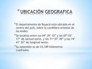 Boyacá se encuentra ubicado en el centro de Colombia, entre los 04o 39’ 10” y los 07o 03’ 17” de latitud norte, y los 71o 57’ 49” y los 74o 41’ 35” de longitud oeste. Tiene una extensión de 23,189 kilómetros cuadrados y una población de 1.282.063 habitantes en 2018. Algunos de sus principales sitios turísticos incluyen Chiquinquirá, la Laguna de Tota, Monguí y Villa de leyva, y sus platos típicos son la changua,
