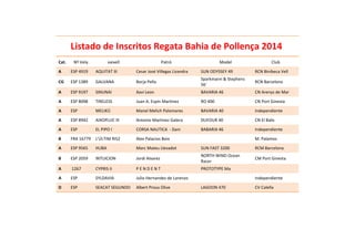 Este documento proporciona una lista de embarcaciones inscritas en la Regata Bahía de Pollença de 2014. Incluye el número de vela, nombre del barco, patrón, modelo, y club de cada embarcación registrada en las categorías A, B, C y D. Hay un total de 14 embarcaciones de España, Francia y sin país registrado en la lista.
