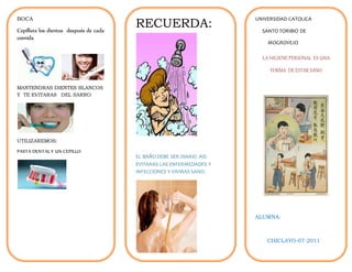 El documento describe la importancia de la higiene personal para mejorar y mantener la salud, prevenir enfermedades infecciosas como la diarrea y las respiratorias. Explica cómo llevar a cabo la higiene del cabello, orejas, cuerpo, pies, boca y la importancia del baño diario para evitar enfermedades e infecciones y vivir sano.