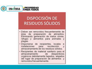 El decreto 3075 de 1997 establece las Buenas Prácticas de Manufactura (BPM) que deben seguir los establecimientos de preparación de alimentos en Colombia. Las BPM incluyen condiciones sanitarias generales para las instalaciones y equipos, así como prácticas específicas para manipuladores de alimentos, lavado de manos, y operaciones de preparación y servicio de alimentos. El objetivo es garantizar la fabricación de alimentos en condiciones sanitarias adecuadas.