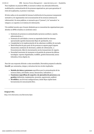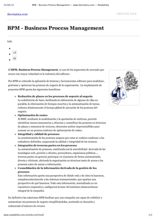 El documento describe el Business Process Management (BPM), que implica aplicar técnicas y herramientas de software para modelar, gestionar y optimizar los procesos de negocio de una organización. Esto puede reducir plazos, optimizar costos, garantizar la integridad y calidad de los procesos, e integrar partes externas en los procesos de forma eficiente. La solución propuesta automatiza, integra y estructura los procesos, datos, actividades y documentos para abordar los desafíos comunes como procesos no automatizados y