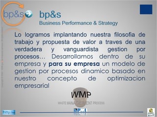 El documento describe los servicios de una consultora centroamericana especializada en la implementación de sistemas de gestión empresarial y gestión por procesos. La consultora ofrece reorganizar internamente las empresas mediante la reestructuración de procesos y un sistema de gestión enfocado en procesos. Para ello, utiliza herramientas tecnológicas que permiten modelar, ejecutar, optimizar y monitorear los procesos de negocio sin necesidad de programación. El objetivo final es mejorar la eficiencia operativa de las empresas y sus rel