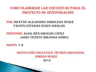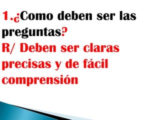 Este documento ofrece recomendaciones para elaborar encuestas para proyectos de investigación. Indica que las preguntas deben ser claras, precisas y de fácil comprensión, contener una sola idea y usar un lenguaje adecuado y respetuoso. También recomienda entre 10 y 30 preguntas para una encuesta y que las preguntas pueden ser abiertas, cerradas o dicotómicas.