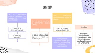 Los brackets son dispositivos ortodónticos utilizados para corregir malposiciones dentales, disponibles en diferentes materiales como metálicos, de cerámica, y zafiro, cada uno con sus ventajas y desventajas. Su colocación requiere un proceso preciso y puede ser directa o indirecta, afectando la duración y efectividad del tratamiento. El manejo adecuado de las fuerzas ortodóncicas es esencial para el movimiento dental y la remodelación ósea, siendo un factor clave para el éxito del tratamiento ortodóntico.
