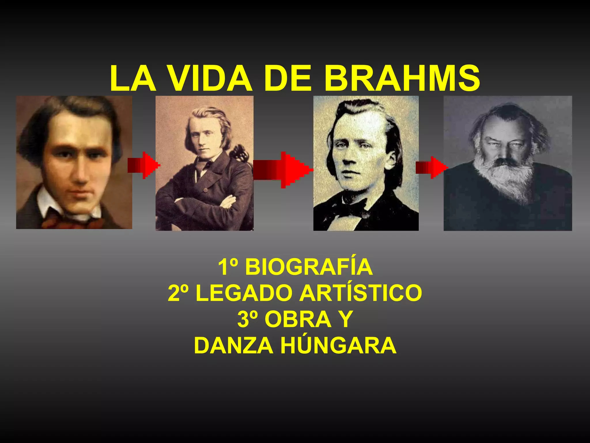 Brahms nació en Hamburgo en 1833 y murió en Viena en 1897. Fue un compositor clásico romántico influenciado por Mozart y Beethoven que destacó en géneros como la sinfonía y el tema con variaciones. Tuvo una estrecha amistad con Clara Schumann, quien estrenó muchas de sus obras pianísticas. Compuso 21 danzas húngaras para piano a 4 manos, orquestando luego 3 de ellas, siendo la no5 en sol menor la más popular.