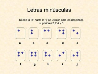 El documento describe los símbolos del alfabeto braille y su formación. Explica que las letras de la "a" a la "j" usan los puntos 1,2,4 y 5 en las dos líneas superiores, mientras que de la "k" a la "t" añaden el punto 3. De la "u" a la "z" añaden el punto 6. Las vocales acentuadas, signos de puntuación, mayúsculas y números tienen símbolos específicos.
