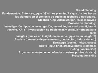 El documento resume los conceptos fundamentales del brand planning y el rol de los planners. 1) Los planners organizan información sobre los consumidores y el mercado a través de investigación cualitativa y cuantitativa para inspirar el desarrollo creativo. 2) Los planners se encargan de cuidar las estrategias de marca. 3) Los planners inspiran a los equipos creativos.