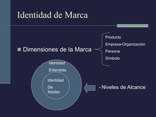 Este documento describe los conceptos clave relacionados con el branding estratégico y la gestión de marcas. Explica las dimensiones de una marca, su estructura, cualidades y proceso de planeación. Se definen conceptos como identidad de marca, imagen, personalidad y posicionamiento. También presenta leyes y principios importantes para el desarrollo exitoso de una marca a largo plazo.