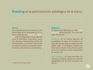 El documento explica qué es el branding y por qué es importante para las empresas. El branding es la administración estratégica de una marca con el objetivo de crear valor de marca a través de posicionamiento y lealtad de clientes. Las etapas clave de una estrategia de branding incluyen investigación, desarrollo de un plan de branding, y la implementación de comunicaciones de marketing y publicidad.