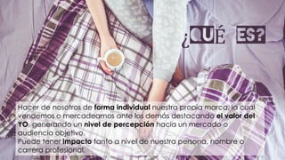 El documento habla sobre el personal branding. Explica que es la estrategia de crear una marca personal para destacar nuestro valor ante los demás y generar una buena percepción entre nuestro público objetivo. Algunos beneficios de tener una buena marca personal incluyen aumentar las posibilidades de éxito, generar credibilidad y hacerse más visible para oportunidades. El documento también brinda consejos sobre los elementos clave para crear una marca personal como la biografía, la imagen y la presencia en línea.