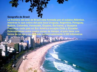 Brasil limita con todos los países de América del Sur excepto Chile y Ecuador. Con una población de 148 millones de habitantes, Brasil es conocido por su diversidad étnica y cultural. Los brasileños se saludan con besos y abrazos, toman baños diarios debido al clima tropical, y disfrutan de comidas como el churrasco y bebidas como la caipiriña.