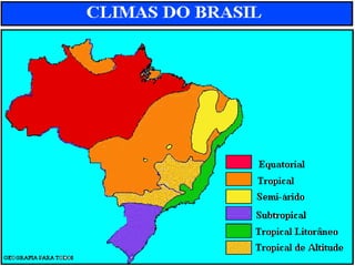 Brasil tiene una gran diversidad de climas que varían según la altitud y latitud, desde clima tropical húmedo hasta templado con heladas. La selva amazónica brasileña es la mayor selva tropical del mundo y alberga al 30% de la biodiversidad mundial, aunque sólo se ha identificado alrededor del 50% de las especies. Dilma Rousseff se convirtió en la primera presidenta de Brasil en 2011 tras ganar las elecciones como candidata del Partido de los Trabajadores. Pelé es considerado por muchos como el mejor futbolista de todos