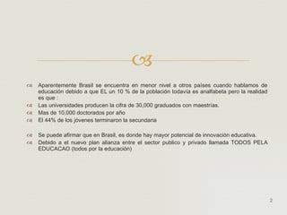 El documento describe los esfuerzos de Brasil para mejorar su sistema educativo, incluyendo la iniciativa "Todos por la Educación" liderada por empresarios para establecer metas educativas ambiciosas. Aunque Brasil tiene excelencia en educación superior, su educación primaria y secundaria ha sido deficiente. Sin embargo, hay signos de progreso gracias a iniciativas gubernamentales y privadas para mejorar la educación básica.