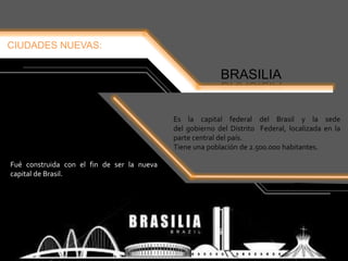 Brasilia es la capital federal de Brasil, construida en la década de 1950 para ser la nueva capital. Fue diseñada por los urbanistas Lúcio Costa y Oscar Niemeyer con una forma de avión o cruz, dividiéndose en ejes norte, sur y monumental, con la Plaza de los Tres Poderes en el centro. La ciudad se compone de amplias avenidas y supercuadras residenciales de 400x400 metros, rodeadas de parques diseñados por Roberto Burle Marx.