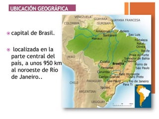 Brasilia es la capital de Brasil, construida en la década de 1950 en el centro del país para descentralizar el país. La ciudad fue diseñada por Oscar Niemeyer y Lucio Costa siguiendo principios modernistas. Brasilia tiene una economía basada en servicios gubernamentales e institucionales y su población ha crecido rápidamente desde su fundación, alcanzando más de 2 millones de habitantes.