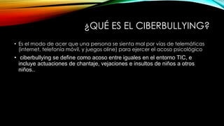 El documento define el ciberacoso o ciberbullying como el acoso psicológico entre iguales a través de Internet, teléfonos móviles y juegos en línea. Explica que el ciberbullying está relacionado con las redes sociales y puede derivar en bullying tradicional o viceversa. Finalmente, señala que las consecuencias del ciberbullying pueden ser graves, incluso llevar a la víctima a pensar en el suicidio.