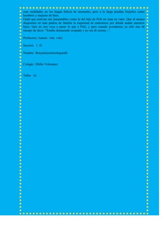 El documento argumenta que los padres deben educar a sus hijos con un poco de hambre y frío para prepararlos para la realidad, en lugar de darles todo y aislarlos del sufrimiento. Relata la historia triste del hijo de Pelé que se involucró con narcotraficantes a pesar de tener una vida acomodada, y sugiere que Pelé estaba demasiado ocupado para notar los problemas de su hijo. Finalmente, recomienda que las historias como esta despierten a los padres a pasar más tiempo con sus hijos y enseñ