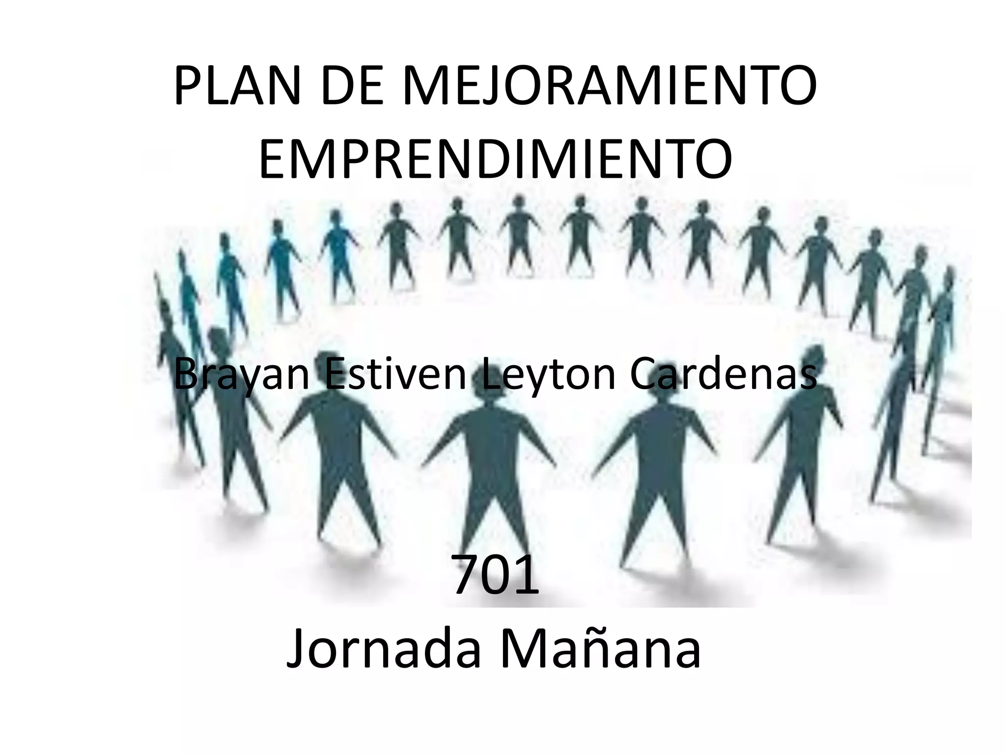 El documento presenta un plan de mejoramiento para el emprendimiento. Define conceptos clave como cultura, emprendedor, emprendimiento y empresarialidad. Explica que el emprendimiento se basa en aprovechar oportunidades de forma ética y responsable. Además, destaca que la formación en emprendimiento busca desarrollar competencias básicas y cultivar una cultura emprendedora. Por último, señala que un plan de negocios describe los objetivos y métodos de un negocio.